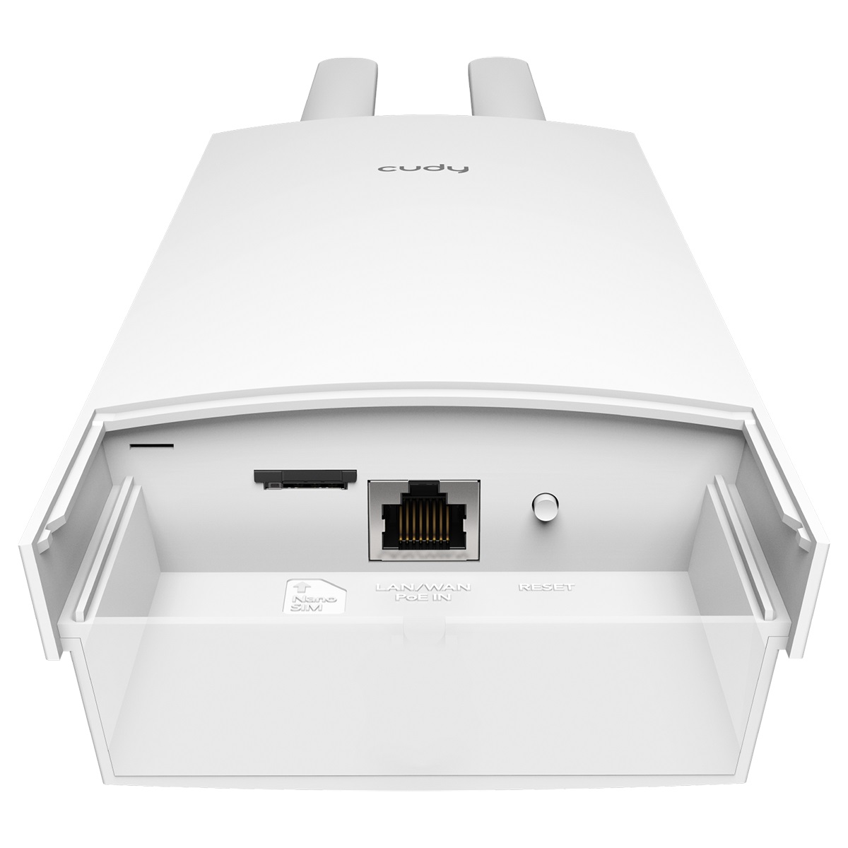 A pole/wall-mounted outdoor 4G LTE Advanced CPE with IP65 casing, one SIM slot, and accepting PoE, featuring AC1200 Wi-Fi, Cudy Mesh main node, and VPN featuresIP65, -40~70°C (-40~158°F), 6kV Surge4G Cat. 6 with Max 300 Mbps DLDL 2-Carrier Aggregation, MIMO4-Stream Dual-Band Wi-Fi867 Mbps + 300 Mbps Wi-Fi50 Connected Devices1and#215; Gigabit Ethernet Port (PoE In)1and#215; Nano SIM Slot802.3at/af, 24~57V Passive PoECudy Mesh, VPN Server and ClientCudy App, Cloud Control